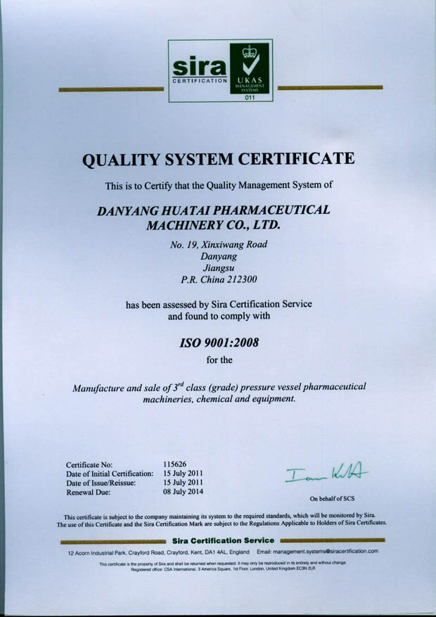 近日,丹陽市華泰制藥機械有限公司順利通過ISO9000認證,此舉不僅是對丹陽市華泰制藥機械有限公司數年來工作的肯定,更是對于我們公司的未來成長壯大的一種鞭策。